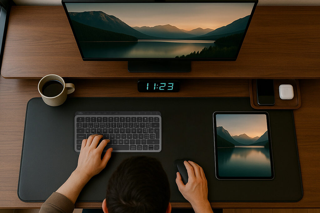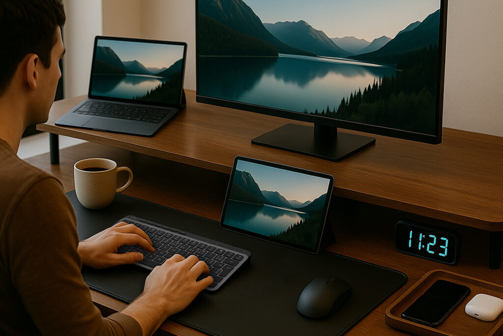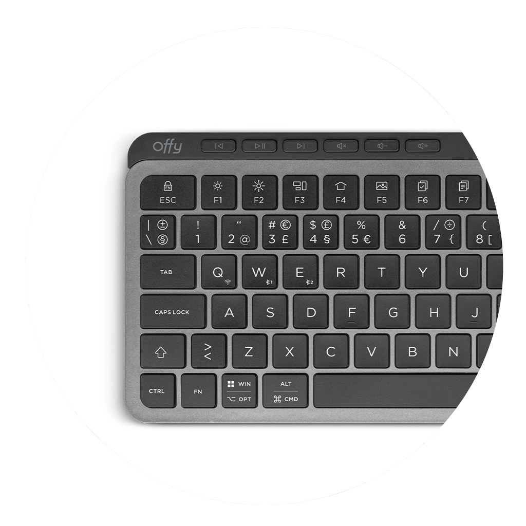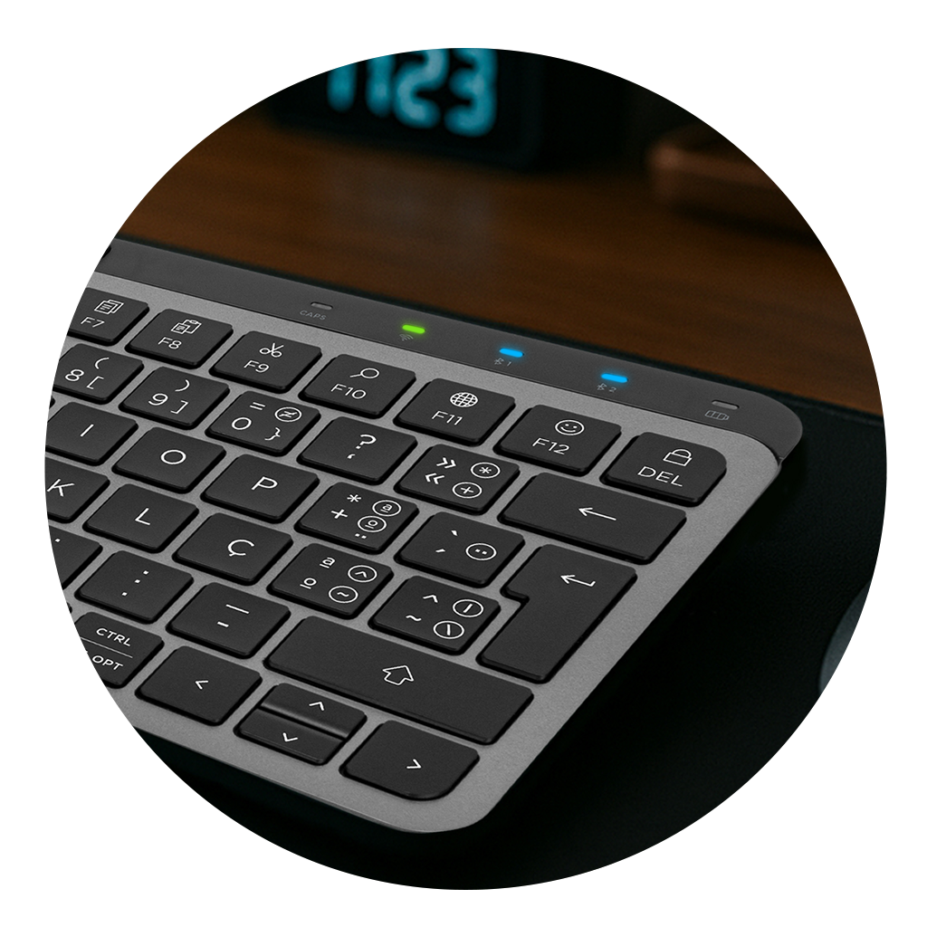 Trabalhe sem limites: ligue-se a três dispositivos diferentes e alterne entre eles com toda a facilidade. Compatível com Windows, Mac, Linux, Android e iPad OS — um teclado que acompanha todos os seus dispositivos.