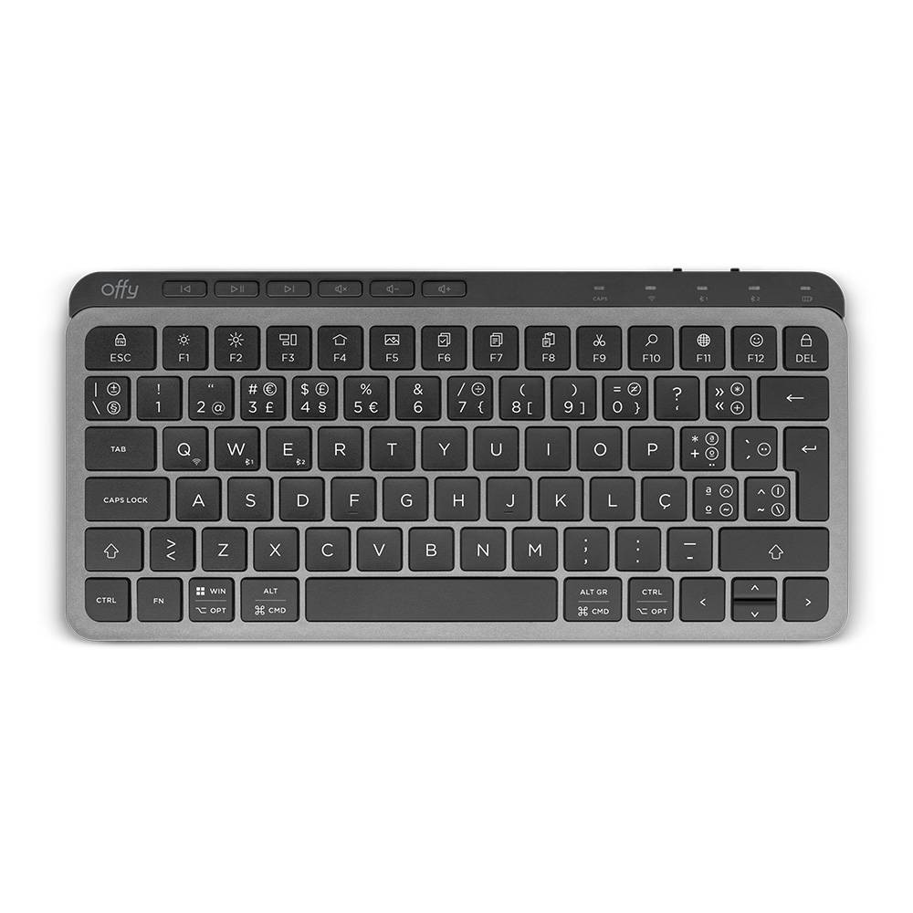 Teclado layout PT com 79 teclas, 6 teclas de atalho dedicadas e 14 atalhos Fn, compatível com até 3 dispositivos via 2.4GHz ou Bluethooth 5.1 e bateria recarregável USB-C que garante até 130h de autonomia.