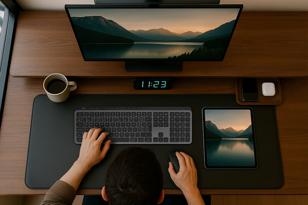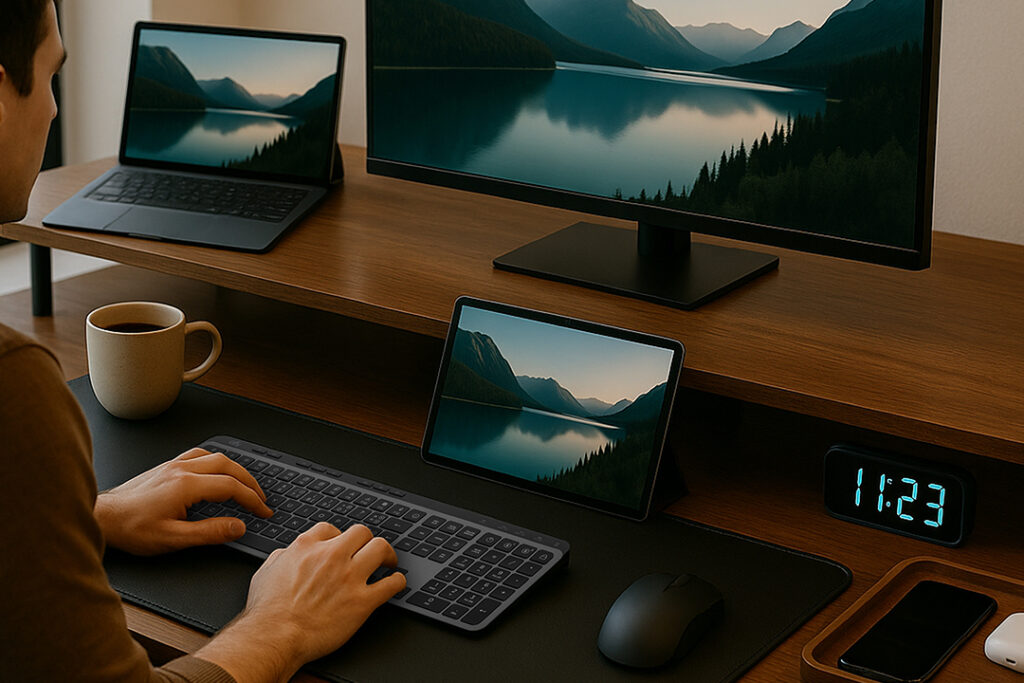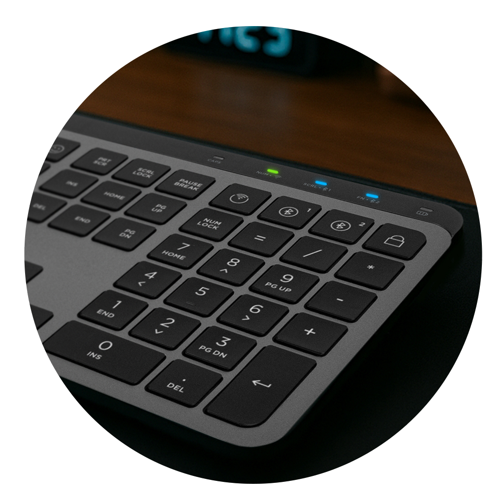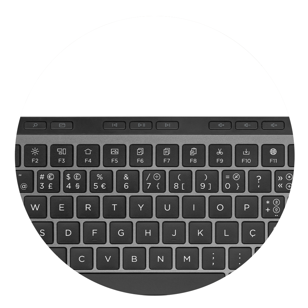 Trabalhe sem limites: ligue-se a três dispositivos diferentes e alterne entre eles com toda a facilidade. Compatível com Windows, Mac, Linux, Android e iPad OS — um teclado que acompanha todos os seus dispositivos.